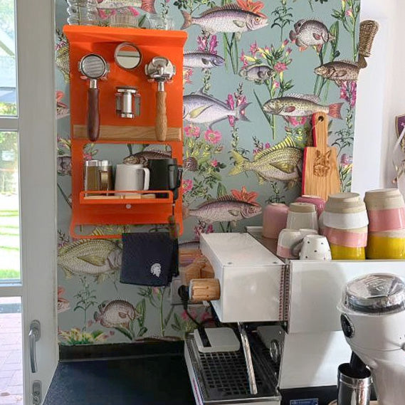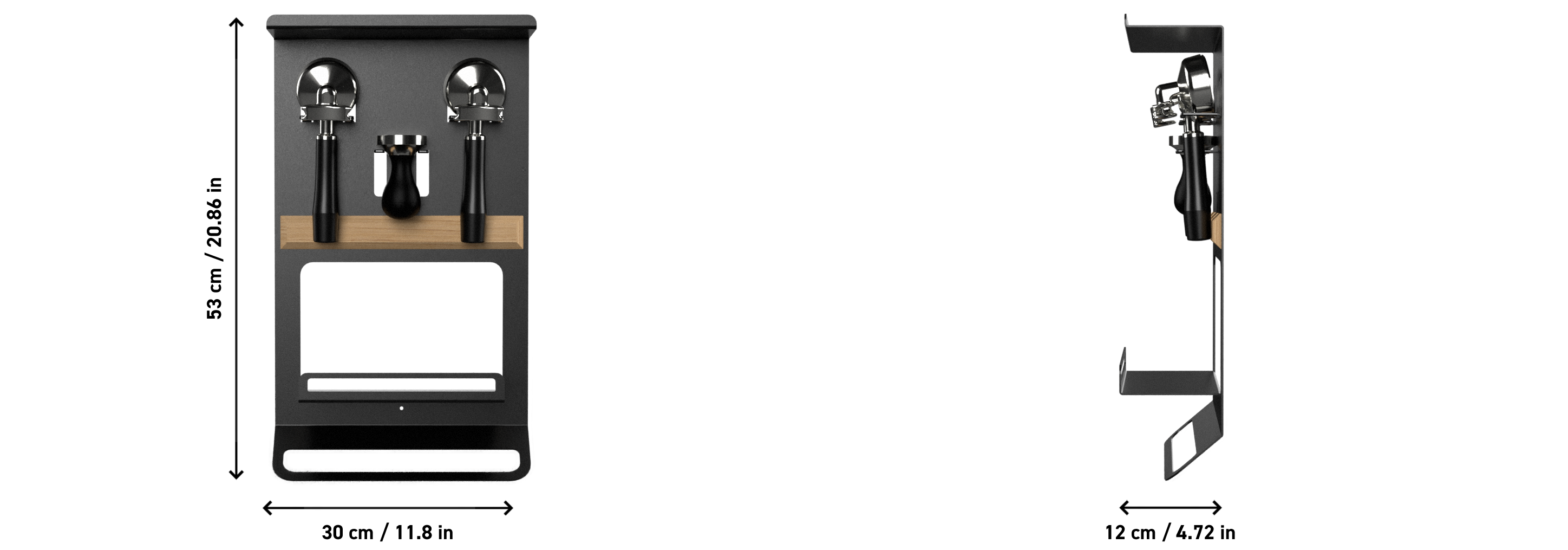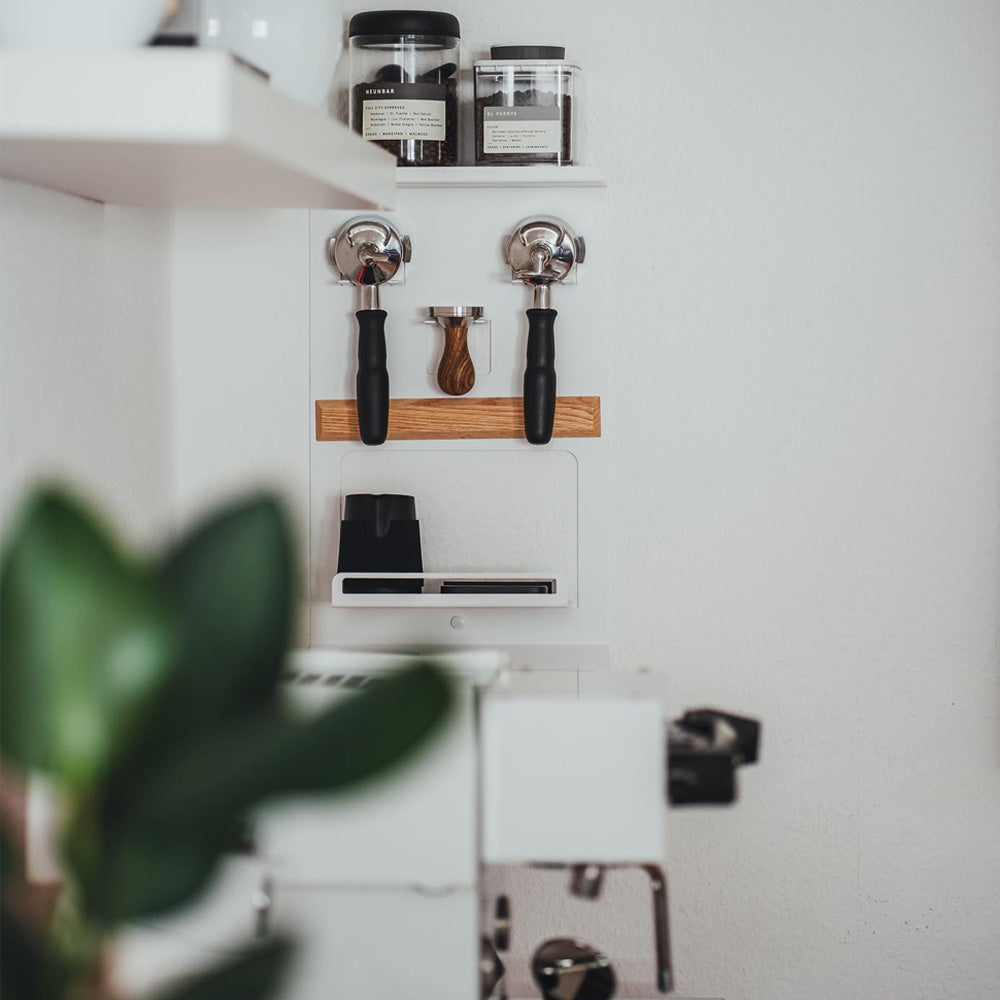 The FLATE® Barista Rack brings order to your coffee bar. With three holders for portafilters, a hanging device for cloths and two storage areas, it is the perfect addition to any espresso machine. Made from powder-coated steel and suitable for all standard portafilter models.