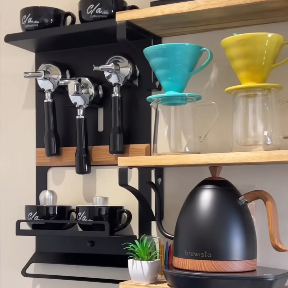 Barista shelf for portafilters, tampers and barista accessories