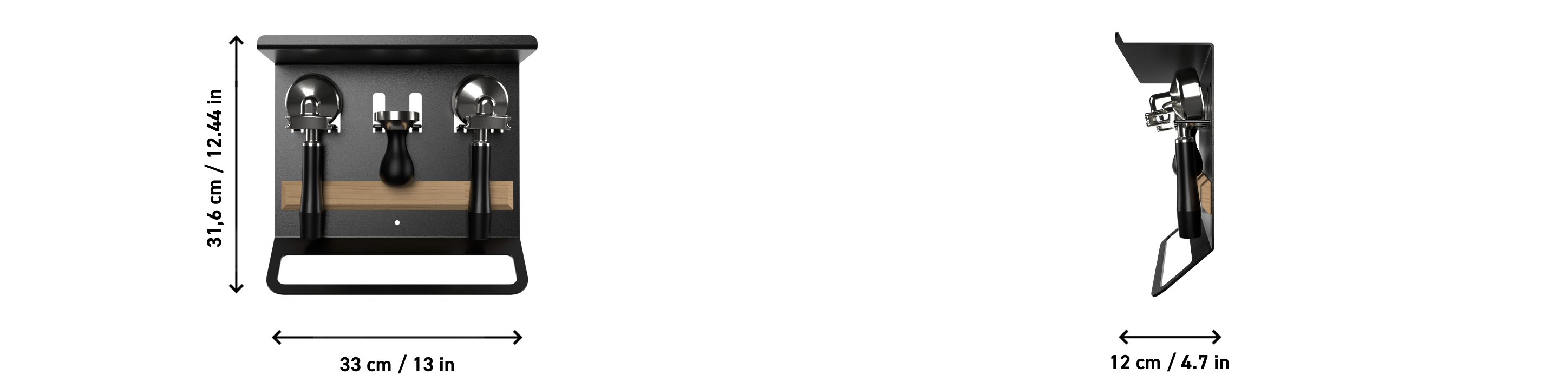 Avec son design plus plat il s’intègre parfaitement dans l’espace et soutient un aspect clair et ordonné de votre coffee bar. Il est idéal pour ceux qui disposent de peu d’espace à cause de meubles hauts. Si vous avez des doutes sur la taille vous pouvez utiliser notre fonction AR Viewer pour placer virtuellement l’étagère dans votre cuisine. Le FLATE® Barista Board est fabriqué en acier thermolaqué robuste et offre différentes options d’organisation : trois supports pour porte filtres ou tampeurs une large surface pour des outils barista supplémentaires comme balances ou conteneurs à grains et une barre pour torchons ou pichets à lait. Le board peut être facilement fixé au mur et est compatible avec presque tous les modèles de porte filtre courants tels que les machines E61 Sage De’Longhi Bezzera Rocket et bien d’autres. Le Barista Board peut également être parfaitement combiné avec le FLATE® Barista Storage Shelf si vous avez besoin d’espace supplémentaire pour grains de café bocaux ou tasses.