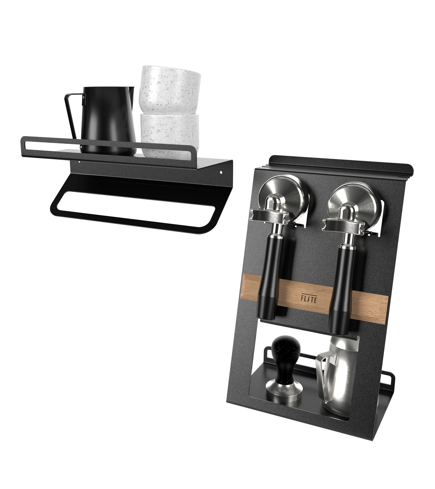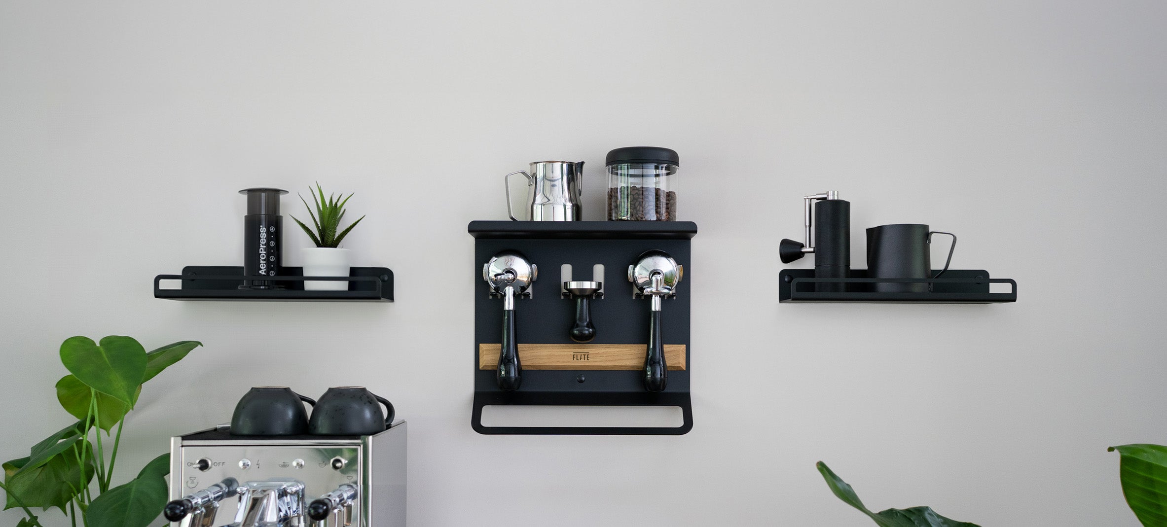 Le mensole FLATE® Barista portano ordine nel vostro bar, indipendentemente dalla macchina o dallo spazio che avete a disposizione. Disponibile in due diverse dimensioni, troverete i supporti e le opzioni di stoccaggio giuste, sia che si tratti di 2 o 3 supporti per tamper o portafiltro, sia che si tratti di un supporto verticale o di un supporto a parete: il ripiano sarà l'aggiunta più importante alla vostra macchina portafiltro, indipendentemente dal produttore.